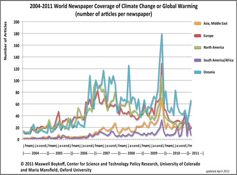 24. Thanks for the interesting post on this. I had a look at the newspapers which make up the chart and could not find any from South America even though there are a number of newspapers published in the region which write in English. I also only saw a couple of papers from Africa mainly in South Africa. This made me wonder how reliable the data is for South America and Africa. I emailed Professor Boykoff about this to ask whether he could shed some more details on this issue. In the meantime if anyone else has any clues that would be helpful.
