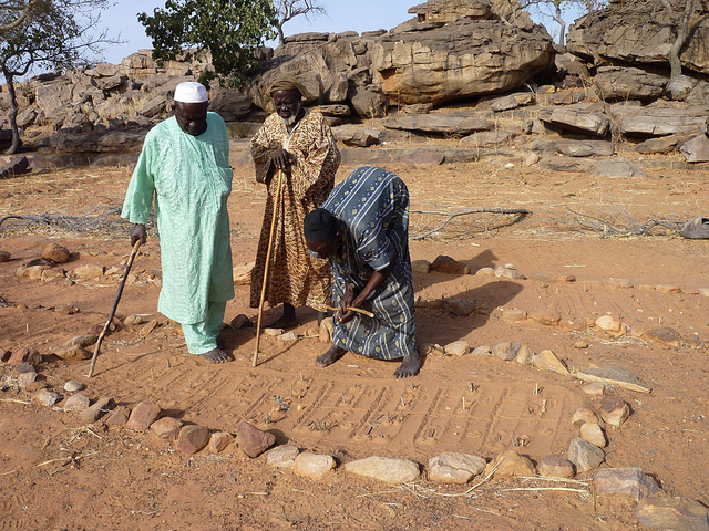 In the wilderness beyond Sangha stood a trio of elders who provide people with advice about problems or changes in their lives. To do this they seek the help of a sacred desert creature — the pale fox (Vulpes pallida). First the men use a stick to scribble symbols in the sand to represent a client’s questions and possible answers. Then they scatter peanuts over the marks they have left and go home for the night. After the sun sets, there is a good chance that a fox will come to eat the nuts. The next morning, the elders check which answers the fox has left its footprints on — and that is the advice they give.