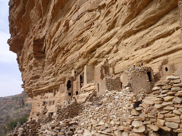 The Dogon people migrated to this area in the 1400s from their homeland far to the South-West. When they arrived they found another group of people called the Tellem living in caves on the cliff. Little is known about these “little red people” and it is not clear whether the Dogon killed them, chased them off or assimilated them into their own society. According to Dogon oral history, the Tellem people could fly, and that’s how they built structures like these high in the cliff face to store grain and house their dead ancestors.